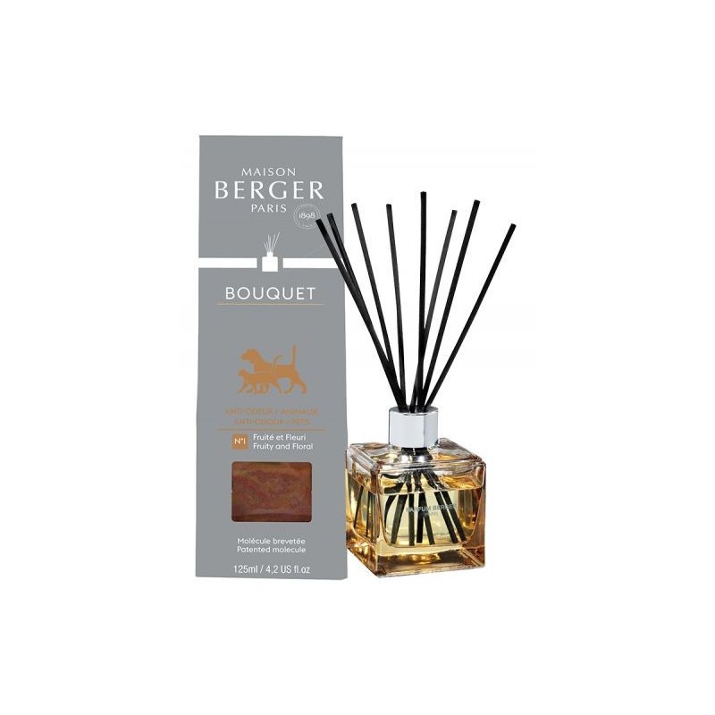 Ce bouquet parfumé cube anti-odeur Maison Berger Paris neutralise les odeurs d'animaux et parfume délicatement la pièce avec son parfum fruité et fleuri (bergamote, muguet, santal).