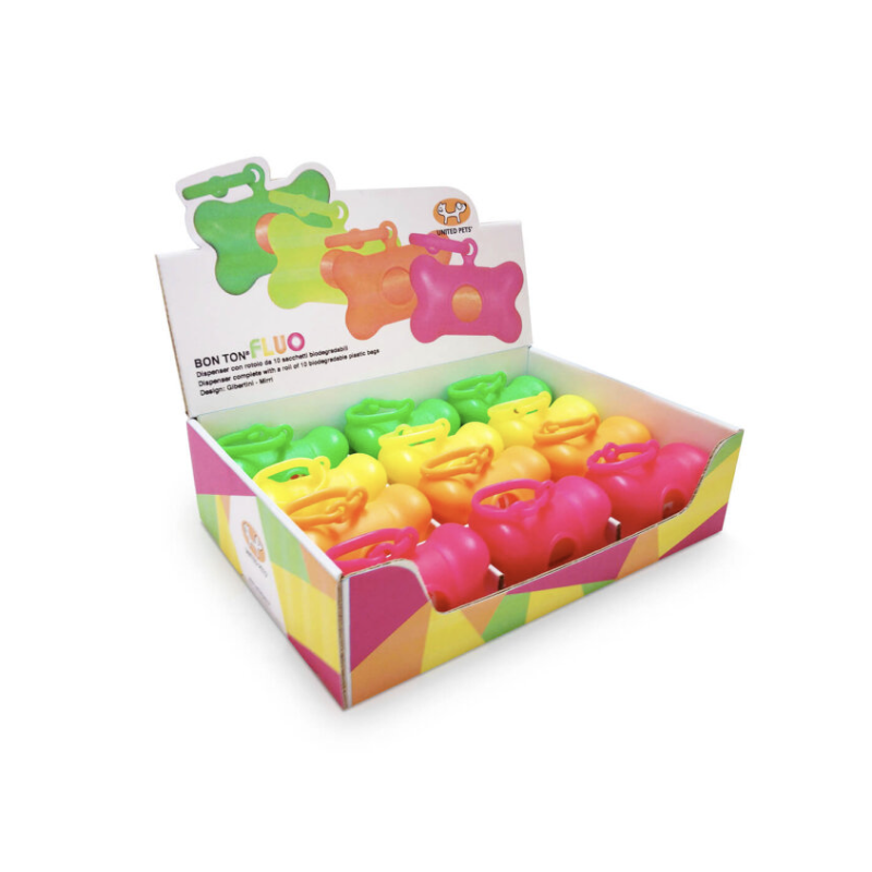 Avec ce distributeur de sacs à crottes, les trottoirs restent propres. Les sacs à crottes sortent de cet original os en plastique, avec lesquels vous pouvez disposer de l'héritage de votre chien de manière fiable et élégante. Le Bon Ton Fluo est disponible dans des couleurs attractives Fluo. L'accessoire intemporel est maniable et peut être facilement attaché n'importe où grâce au petit anneau, sur la laisse, le sac à main, la ceinture, etc. Les sacs sont assez grands pour une utilisation et un remplissage facilité. Les recharges sont également disponibles dans notre shop.