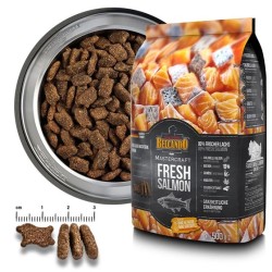 Composition : saumon frais (80 %); amarante (5,5 %); farine de pois; farine de fève (Vicia faba); pois chiches, séchés; levure de bière, séchée (1 %, source de bêta-glucanes et mannane-oligosaccharides); plancton de mer, moulu (krill, 0,8 %); gousses de caroube, séchées; marc de pommes séché; phosphate bicalcique; graine de chia (0,4 %); légumes, séchés (total: 0,3 %; carottes, panais, betterave rouge, poireau); maërl (Algues marines calcaires) (0,3 %, Lithothamnium calcareum); saumon, hydrolysé; algues séchées (0,2 %, Chlorella vulgaris); chlorure de sodium; canneberges (0,06 %); myrtilles, séchées (total: 0,06 %; sorbiers, cynorrhodons, myrtilles, baies de sureau, cassis); herbes, séchées (total: 0,06 %; feuilles d’ortie, racines de gentiane, petite centaurée, camomille, fenouil, cumin, herbe de gui, herbe de millefeuille, feuilles de mûres); chlorure de potassium; yucca schidigera; extrait d’olives (0,003 %, Olea europaea).