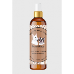 L'eau Miraculeuse a été pensée et développée pour le bien-être de votre boule de poils tout en respectant notre belle planète. Sa formule saine et innovante est composée à 99% d'ingrédients d'origine naturelle et est adaptée au pH de la peau de votre compagnon à 4 pattes. Riche en hydrolats et huiles essentielles biologiques, notre lotion anti-démangeaisons est garantie sans sans paraben, sans colorant, sans sulfate, sans silicone et sans parfum de synthèse. Elle est idéale pour les peaux irritées, abîmées, sujettes aux démangeaisons et inconforts. Elle convient à tous les pelages, poils courts et poils longs sans distinction de couleur.