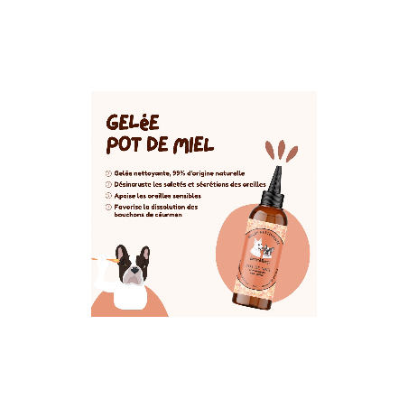 Gelée nettoyante pour les oreilles des chiens, 99% d’origine naturelle, vegan, cruelty free, eco-friendly et fabriquée en France.! Nettoyante, rafraichissante, hydratante, apaisante, protectrice...La gelée Pot de miel est formulée sans paraben, sans sulfate, sans silicone et sans parfum de synthèse.