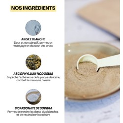 Liste complète : Argile blanche, Bicarbonate de soude, Ascophyllum nodosum, Papaye, Propolis, carotte.