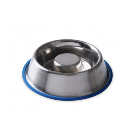 Gamelle en inox avec partie bombée au centre, oblige le chien à manger jusqu'à 5 fois plus lentement, anneau en caoutchouc pour une stabilité maximale, passe au lave-vaisselle.