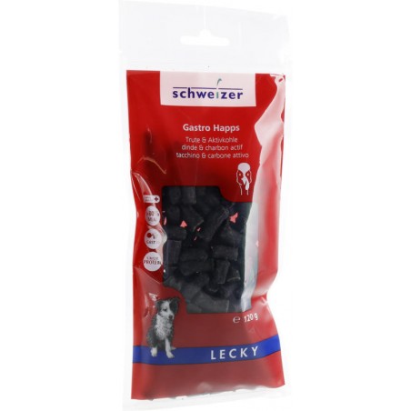 Lecky Gastro Happs Trute & Charbon actif sont des bouchées moelleuses, sans gluten, composées de 87% de viande de dinde et de 6% de charbon actif. Les friandises de viande pour chiens aident à lutter contre la diarrhée et les selles molles. Le charbon actif qu'ils contiennent apaise le tractus gastro-intestinal de manière naturelle. Grâce au processus de séchage doux, les précieux principes actifs et oligo-éléments sont largement préservés. Avec une seule source de protéines, le snack convient également aux chiens sensibles.